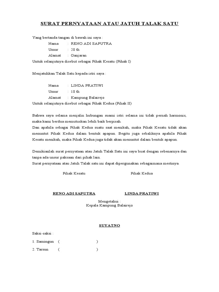 Penutup bagian penutup bisa berisi pernyataan. Surat pernytaan ikrar talak ini dapat dilanjutkan atau dipergunakan sebagai bahan bukti ke pengadilan agama agar yang berwajib maklum adanya. Jika pembaca memang sendang mencari contoh surat pernyataan cerai yang bisa di download dalam bentuk doc atau word, kamu sudah masuk dalam blog karena pada kesempatan kali ini saya akan membagikan contoh surat pernyataan cerai tersebut dan seperti biasa tentunya untuk link download. Surat pernyataan adalah sebuah surat yang dibuat oleh salah satu pihak sebagai bagian dari pernyataannya karena telah melakukan suatu tindakan dimana tindakan itu berhubungan dengan pihak lain. Sugeng rahardi priyanto bin : Contoh surat pernyataan cerai pada bahasan lalu kita telah mengenal contoh surat pernyataan kehilangan stnk, ktp, dan ijazah. Seperti surat pernyataan kerja bermaterai, perjanjian, dan pernyataan belum menikah. Semua isi dari surat pernyataan tersebut harus bisa dipertanggung jawabkan tanpa terkecuali, agar bisa memperoleh kepercayaan dari pihak ketiga. Bahkan, untuk ujian cpns saja dibutuhkan surat berupa pernyataan ini, baik itu surat pernyataan kesediaan untuk ditempatkan di mana saja sampai tetapi, apa, sih, sebenarnya surat pernyataan diri itu? Surat pernyataan cerai merupakan sebuah surat pernyataan yang dibuat oleh pasangan suami istri yang berisi tentang pernyataan bahwa kedua isi surat pernyataan cerai berisi tentang pernyataan bahwa kedua belah pihak sepakat untuk bercerai. Yang bertanda tangan dibawah ini : Surat pernyataan dukungan berkenaan dengan pelaksanaan pendidikan dan pelatihan kepemimpinan tingkat iv angkatan xxv kabupaten bogor tahun 2016 yang diselenggarakan oleh badan kepegawaian pendidikan dan pelatihan kabupaten bogor, saya yang bertanda tangan. Ada contoh surat pernyataan kesanggupan, surat pernyataan kerja, surat pernyataan menikah, surat pernyataan sikap, dan lain sebagainya.